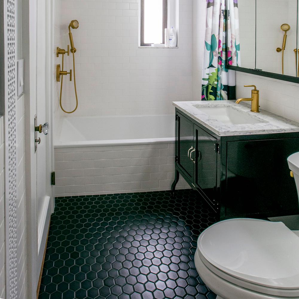 Brighton beach black encaustic look hexagon tile. Small bathroom with black hexagon bathroom floor tile and. This byot diy project is all about how to tile a bathroom floor with hexagon tile. Hexagon carrara white and black polished surface hexagon marble mosaic tile packing:5 pieces a box,72 boxes a pallet,28 pallets a container.