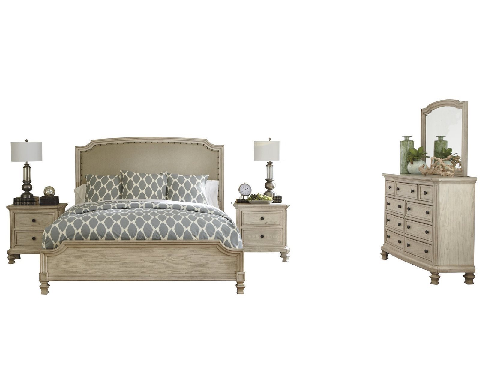 King bed, dresser, mirror, 2 nightstands.