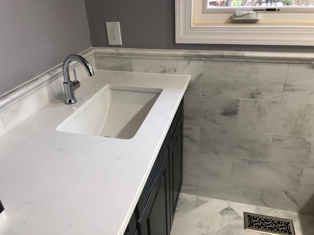 Hampton Carrara Marble Bathroom. Less stark here because there is more white in the tile. Is a natural stone marble that illustrates a classical romance.