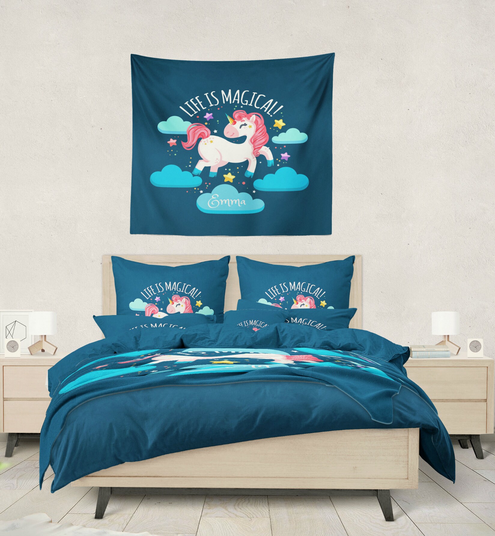 Every night when you hop into bed, remind yourself to believe in miracles by summoning the power of unicorns shop for unicorn bedding set, unicorn personalized bedding set. There's nothing mythical about our unicorn bedding. They are available for all sizes including single, twin, full, queen, king.